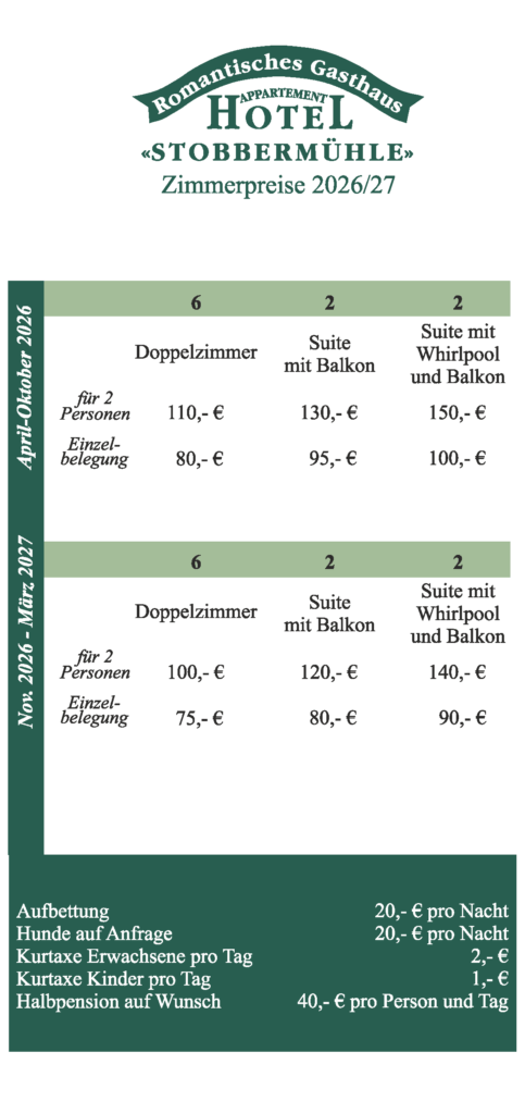 Die Stobbermühle verfügt über 8 großzügige Einzel- und Doppelzimmer und 5 Suiten, die mit Sorgfalt und Liebe für Sie eingerichtet sind.